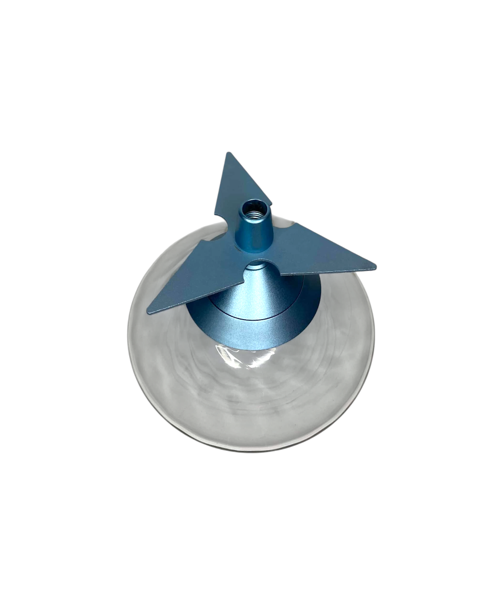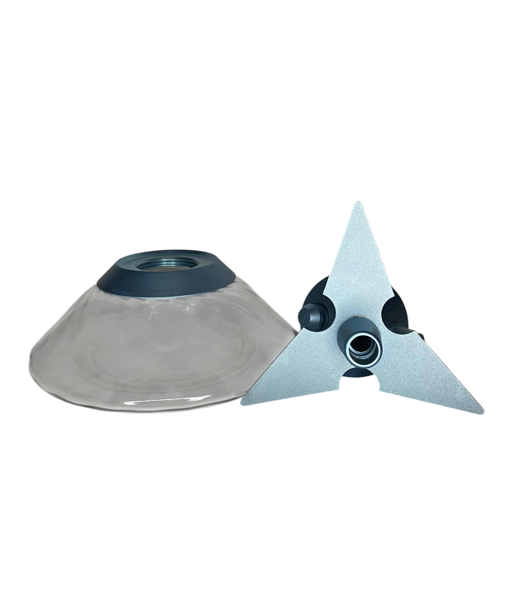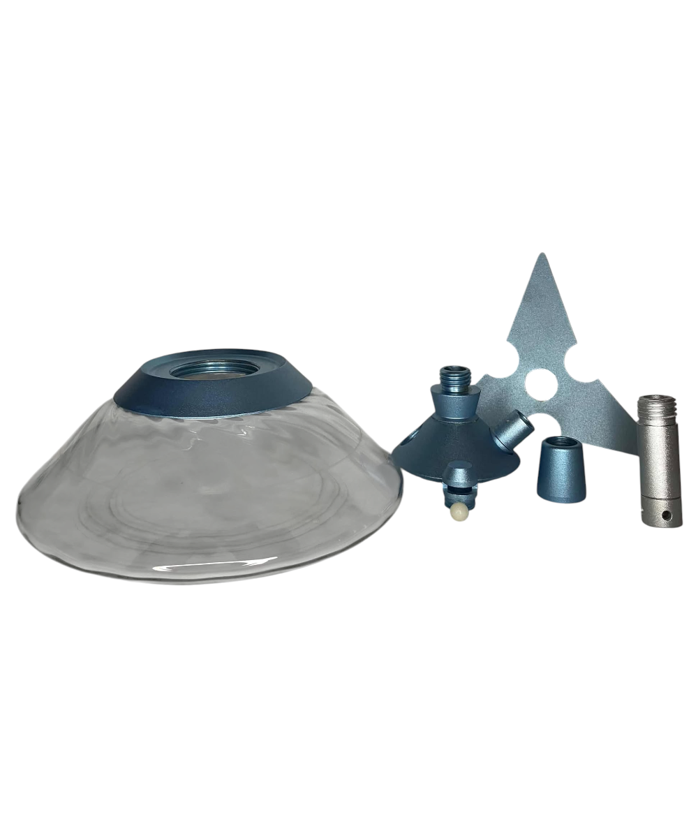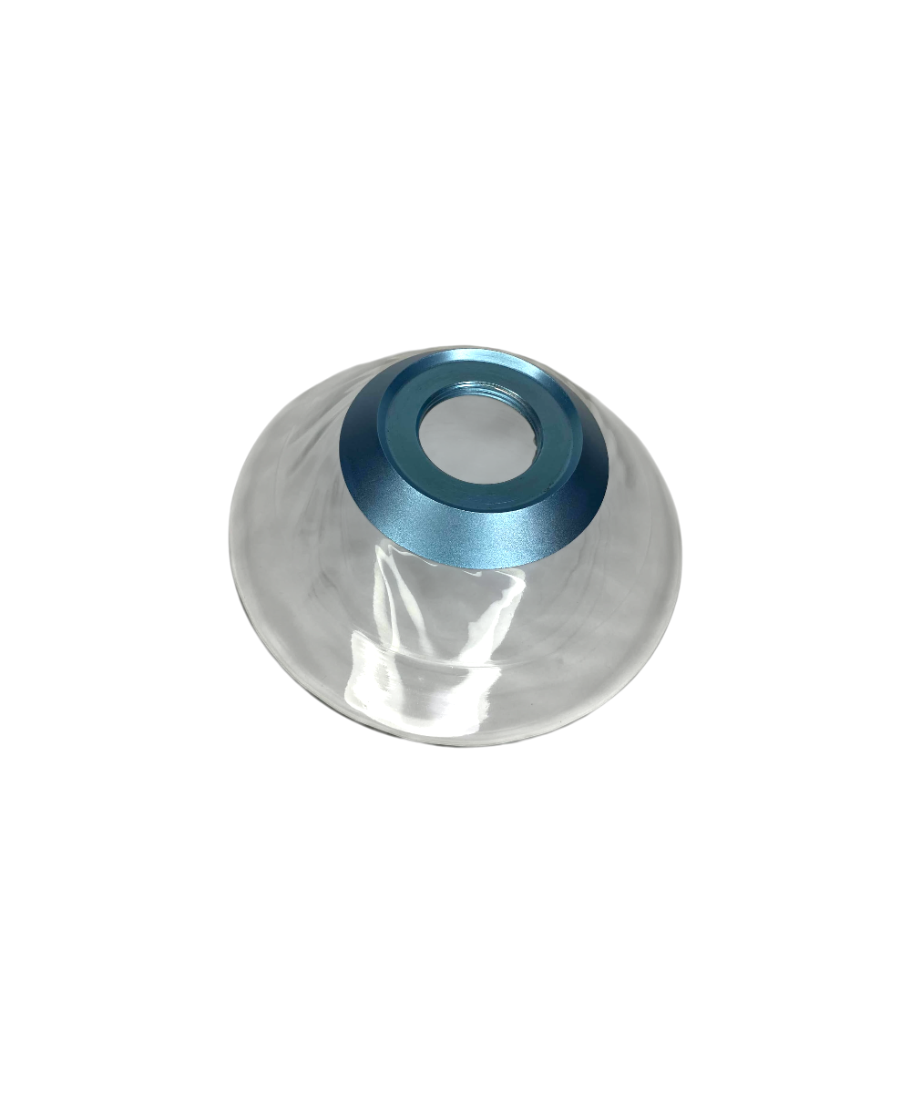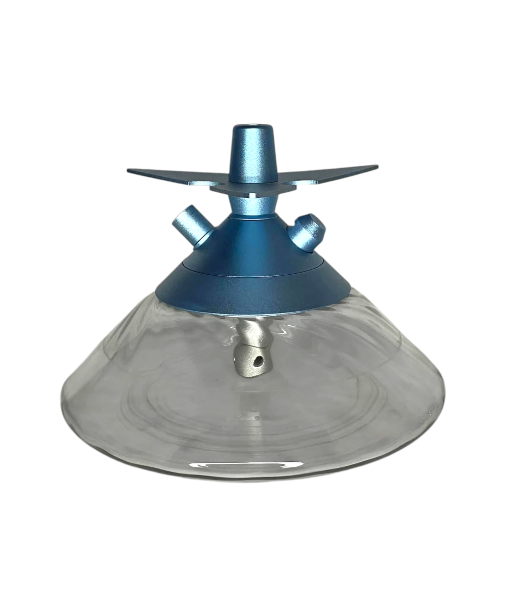 - Base Curta e Larga: A base de vidro tem um formato largo e baixo (quase como um disco ou pires invertido), o que contribui para a estabilidade do conjunto, apesar de sua altura reduzida. A rosca na parte superior da base é visível, confirmando a vedação segura.